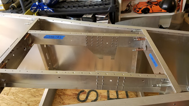 I also installed the mixer mount beams and the access panel that goes beneath them. The access panel ended up being pretty involved! The mixer mount beams were pre-drilled on the bottom side for all the holes, including the nutplate mounting holes. So I had to be real careful that everything lined up. Once I had all the other holes drilled, I ended up just taking the floor skin off and putting the channels on top so I could drill through the existing nutplate rivet holes from that direction.